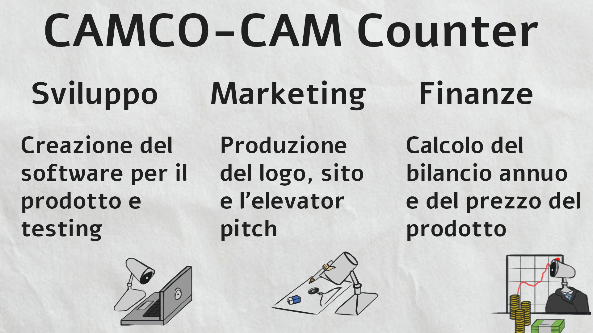 Ognuno di noi ha scelto uno tra tre reparti (Finanze, Marketing, Sviluppo), a seconda delle proprie competenze e interessi, dando così vita al team definitivo.